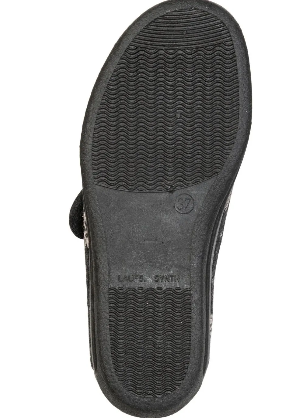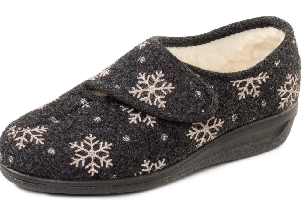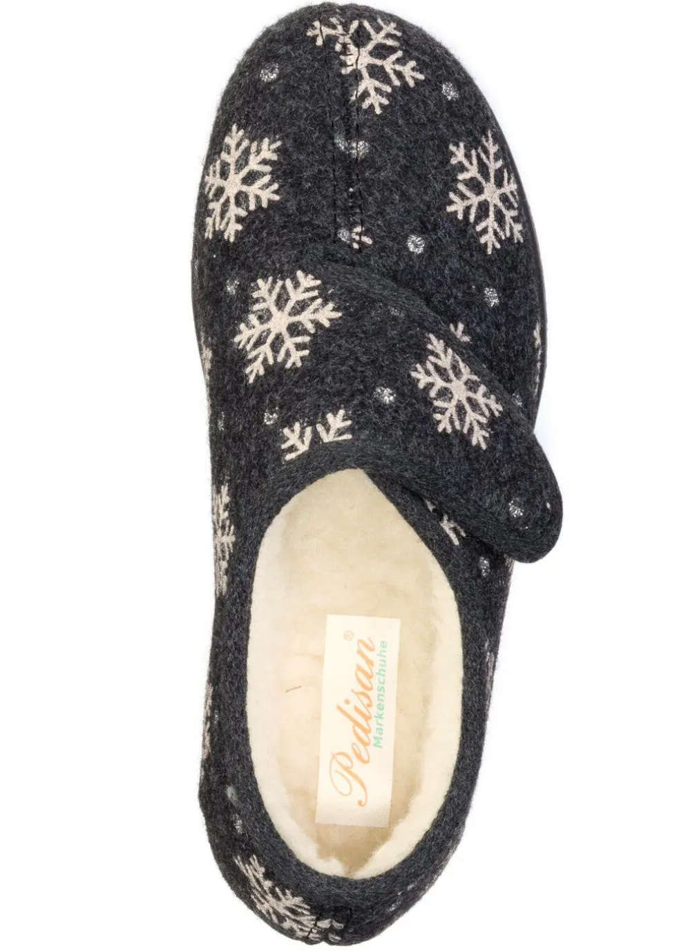 Schwarze Hausschuhe aus Filz mit dezent glitzerndem Schneeflocken-Druck: Weite H, verstellbare Klettspange, Warmfutter und Decksohlenbezug aus 100% Schurwolle, superleichte Synthetik-Riffelsohle sowie 25 mm Keilabsatz