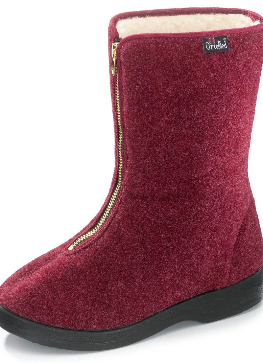 Kuschelige Hausschuhe aus weichem Textilmaterial mit praktischem Reißverschluss: in Weite H, Warmfutter und Fußbettbezug aus reiner Wolle, superleichte PU-Laufsohle sowie 20 mm Keilabsatz. Schafthöhe ca. 24 cm
