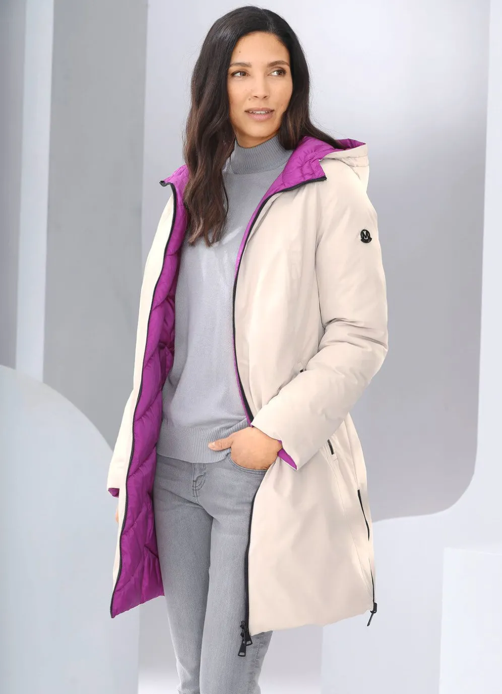 Ganz egal wie man ihn dreht und wendet. Dieser flippige Wende-Kurzmantel zeigt sich garantiert von seiner Schokoladenseite: Durchzugsband und Stopper an der festen Kapuze, durch 2-Wege-Reißverschluss hoch schließbarer Stehkragen sowie Reißverschluss an den Seitenschlitzen. Die gesteppte, pinkfarbene Seite zeigt Schubtaschen mit Blende und verdecktem Drucker, die ungesteppte Seite in Sand ist mit Reißverschlusstaschen gearbeitet. Länge ca. 90 cm, ab Gr. 40 ca. 92 cm, ab Gr. 46 ca. 94 cm.