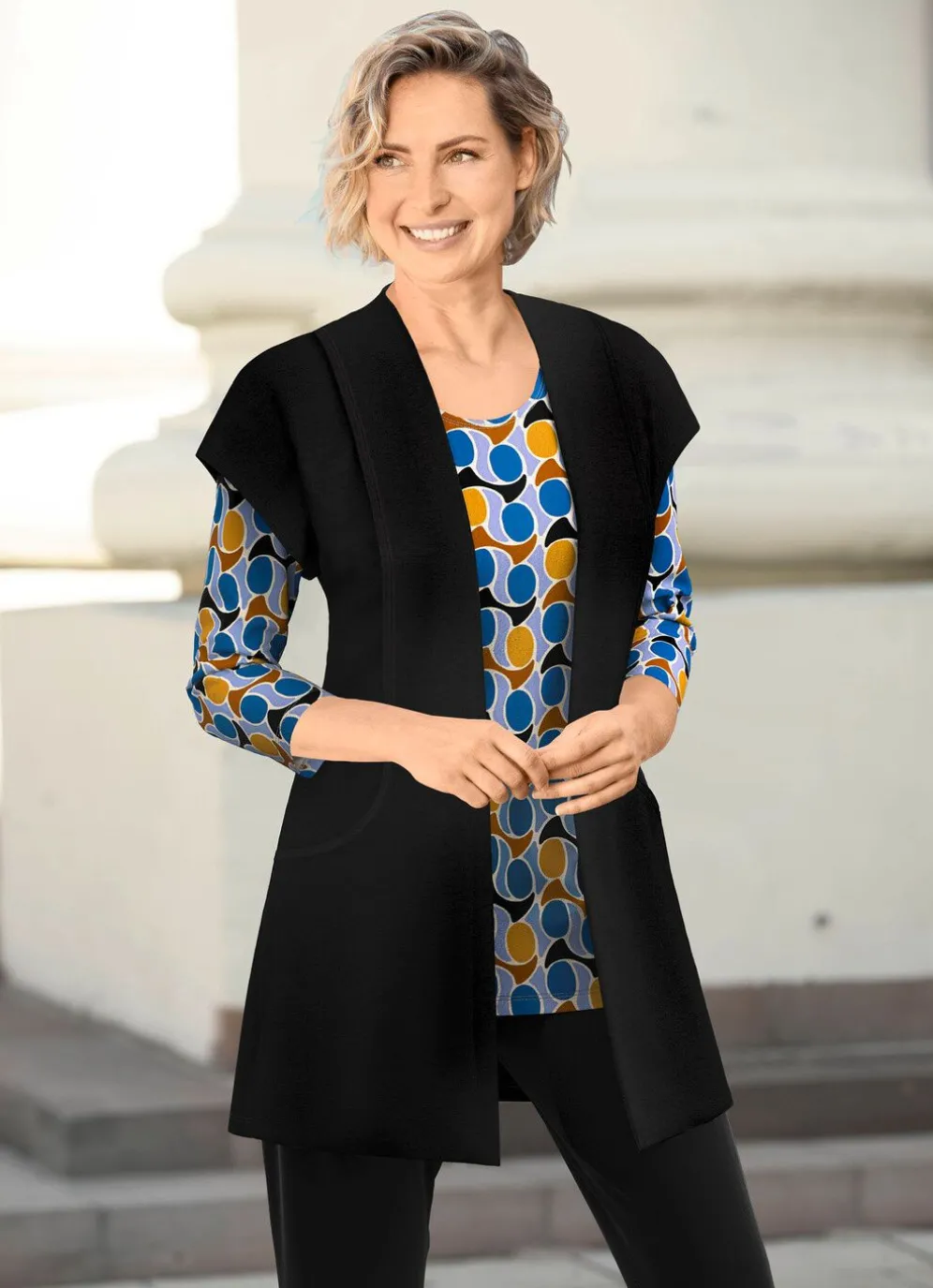 Komfortable schwarze Weste in verschlussloser Form mit überschnittener Schulterpartie und praktischen Eingrifftaschen.