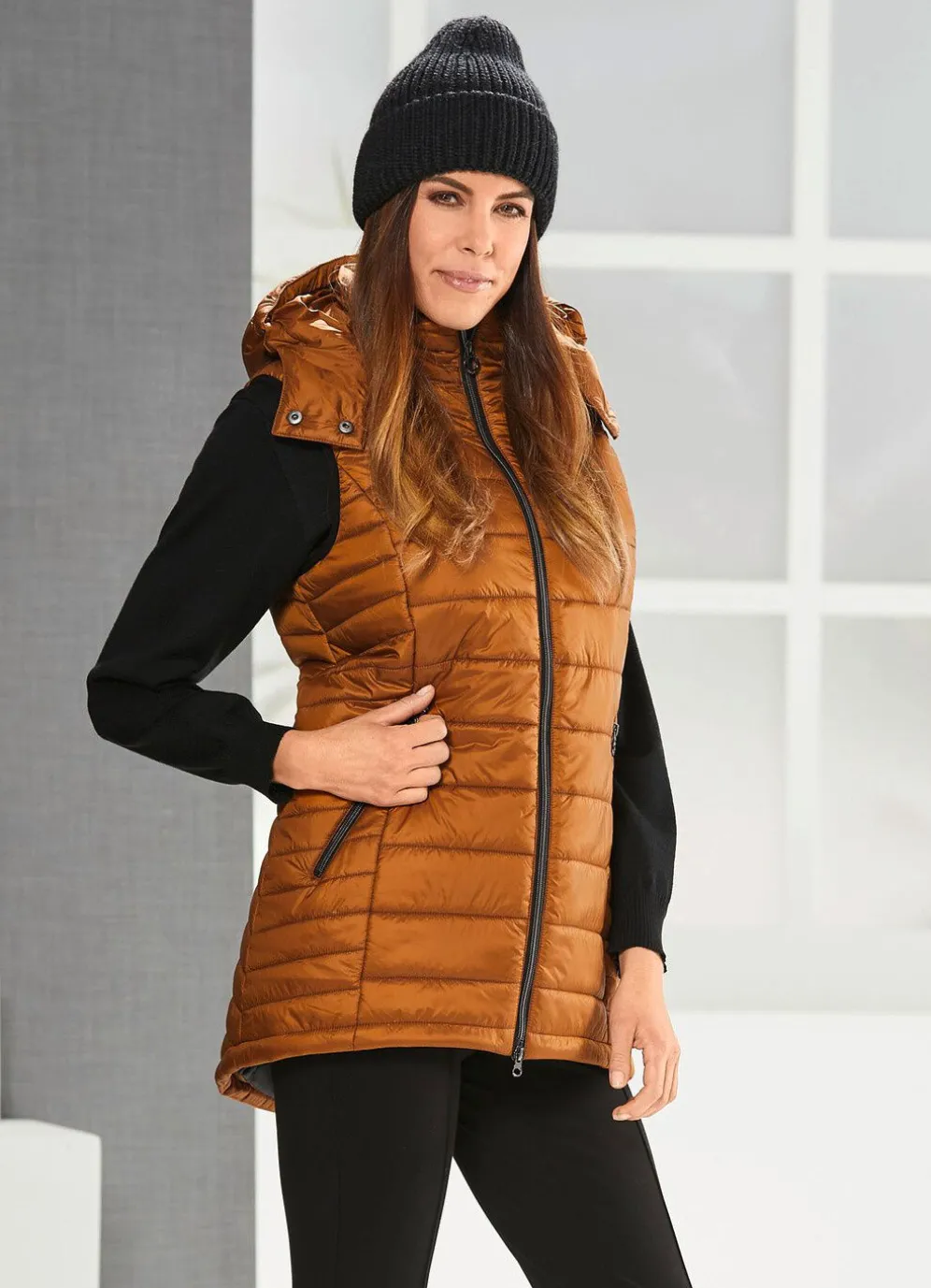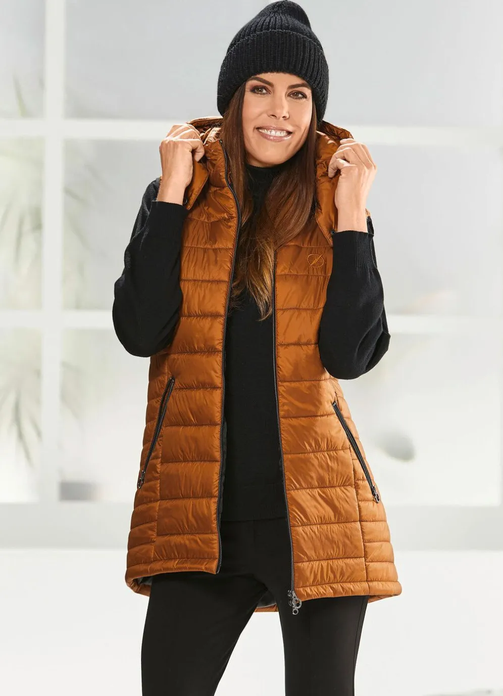 Perfekt und absolut modisch ist diese mandelfarbene Weste mit Durchzugsband, Stopper und Riegel mit Druckern an der abnehmbaren Kapuze, durch 2-Wege-Reißverschluss hoch schließbarem Stehkragen, Reißverschlusstaschen, schwarzem Elastikbändchen an den Armausschnitten, einer Innentasche sowie leicht verlängertem, abgerundetem Rückteil, Länge ca. 84 cm.