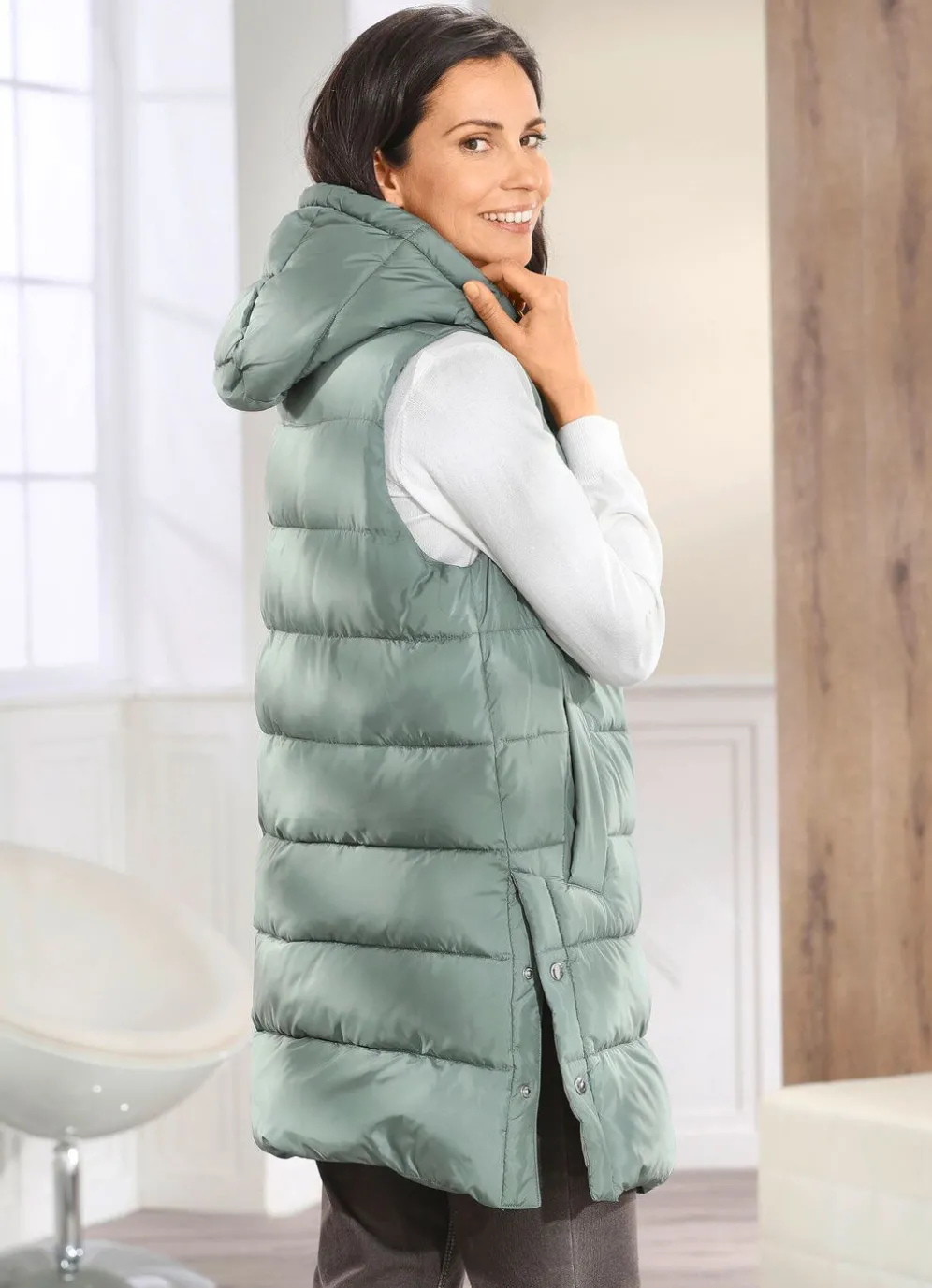 Resedagrüne Weste: feste Kapuze mit Bindeband, 2-Wege-Reißverschluss unter der verdeckten Druckerleiste, Schubtaschen mit breiter Blende, Seitenschlitze mit Druckern sowie eine Innentasche. Länge ca. 82 cm, ab Gr. 44 ca. 83 cm, bei Gr. 52 ca. 84 cm.