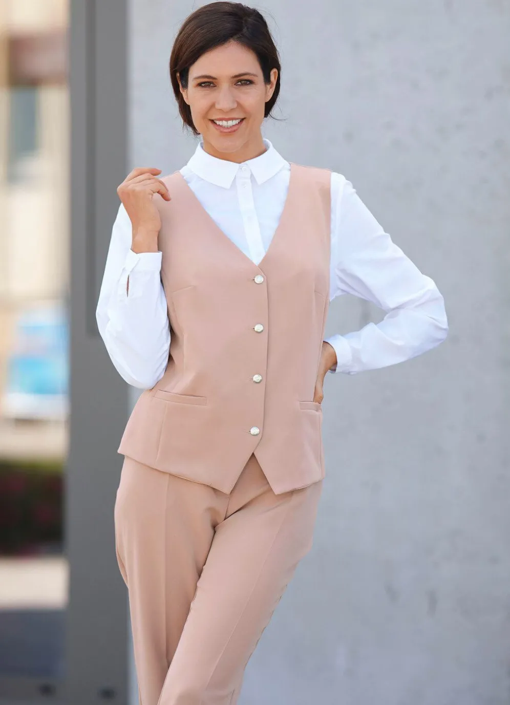 Modische Weste in Puder mit Knopfleiste und Paspeltaschen. Länge ca. 54 cm, ab Gr. 46 ca. 56 cm.