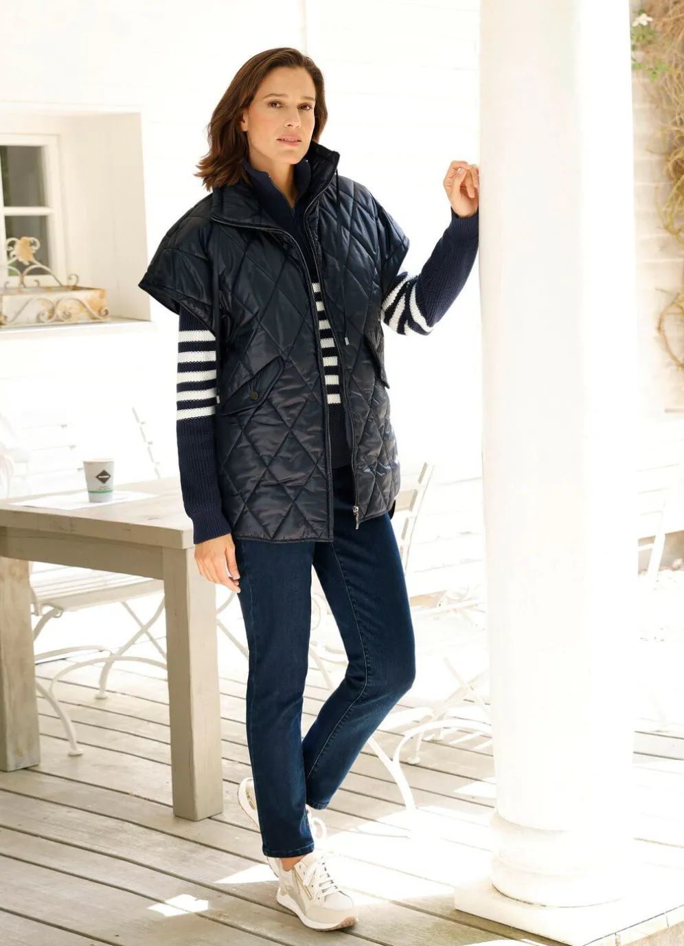 Gerade geschnittene Weste mit Rautenstepp: durch Reißverschluss hoch schließbarer Stehkragen mit Bindeband, Pattentaschen mit Druckknopf, Seitenschlitze mit Druckern sowie verlängertes Rückteil. Länge ca. 80 cm.