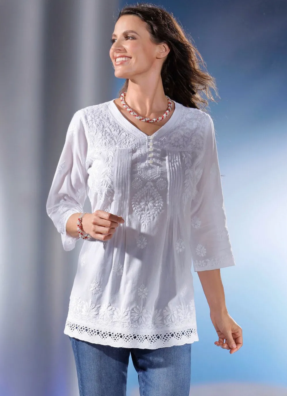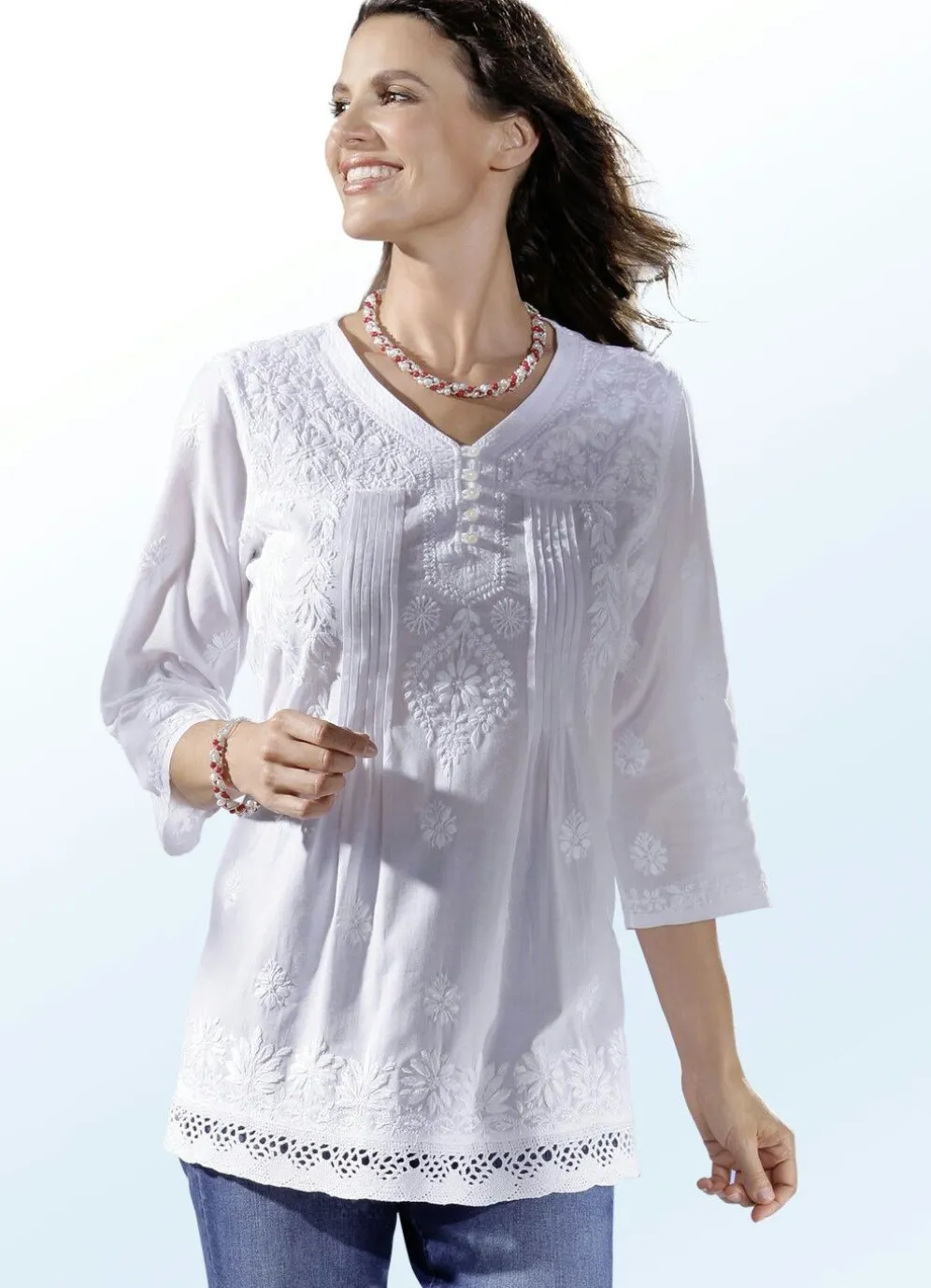 Fabelhafte, allover bestickte Tunika in Weiß, mit kurzem Schlingenknopfverschluss am V-Ausschnitt, toller Biesenzier mit aufspringenden Fältchen im Vorderteil, 3/4-langen Ärmeln sowie zauberhafter Häkelborte am Saumabschluss rundum.