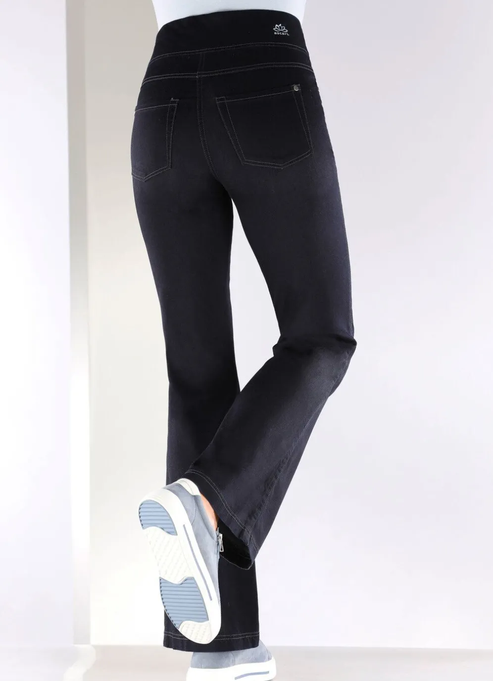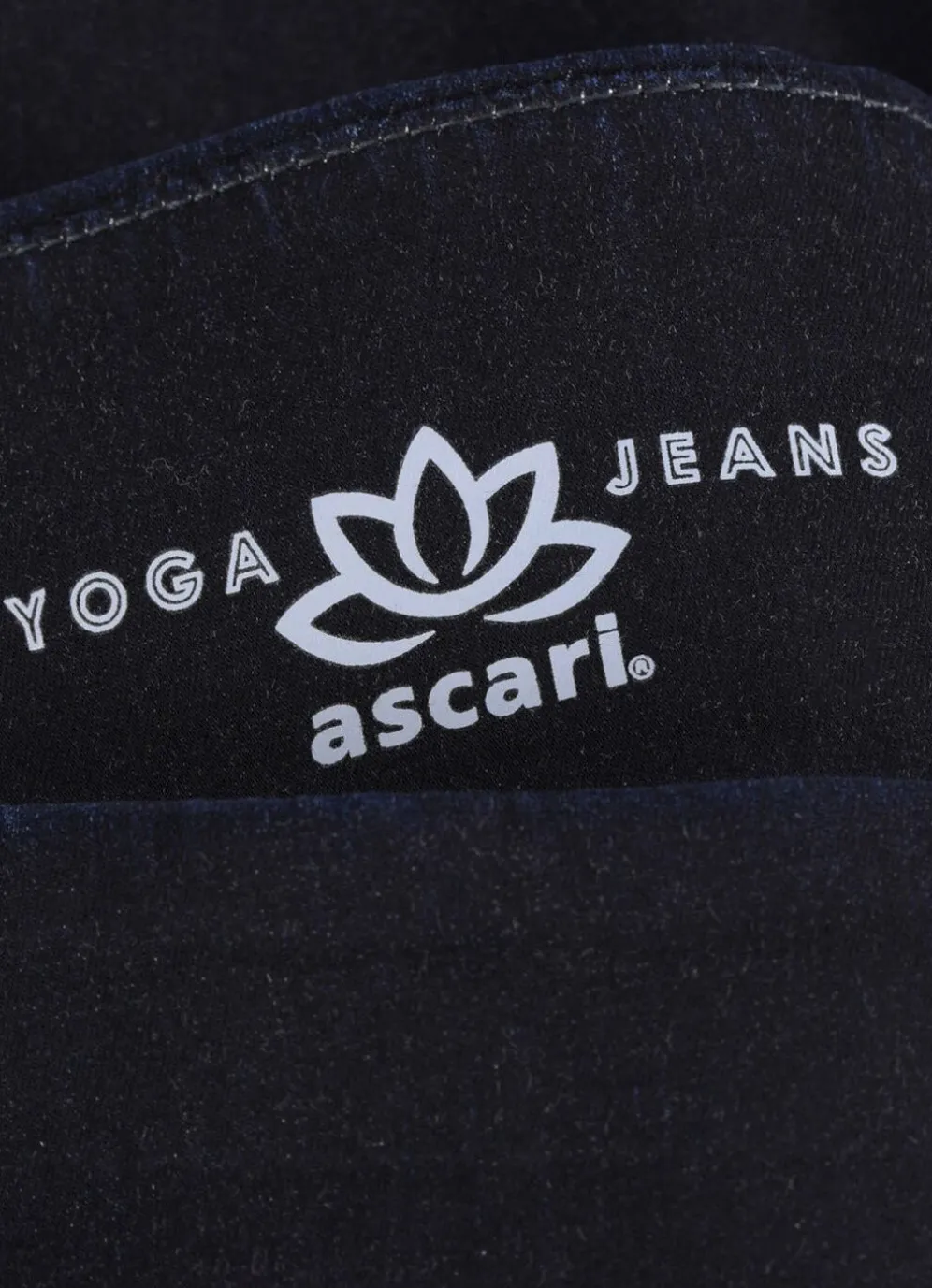 Durch hohe Elastizität und exzellentem Rücksprungverhalten macht diese dunkelblaue Yoga-Jeans mit ausgestellter Fußweite jede Bewegung mit: Schlupfform, glatt anliegend dank der innenliegenden Gummibund-Einlage, Reißverschluss-Zierblende, Seitentaschen, aufgesetzte Gesäßtaschen sowie Jeanssattel. Innenbeinlänge ca. 77 cm, Fußweite ab 50 cm.