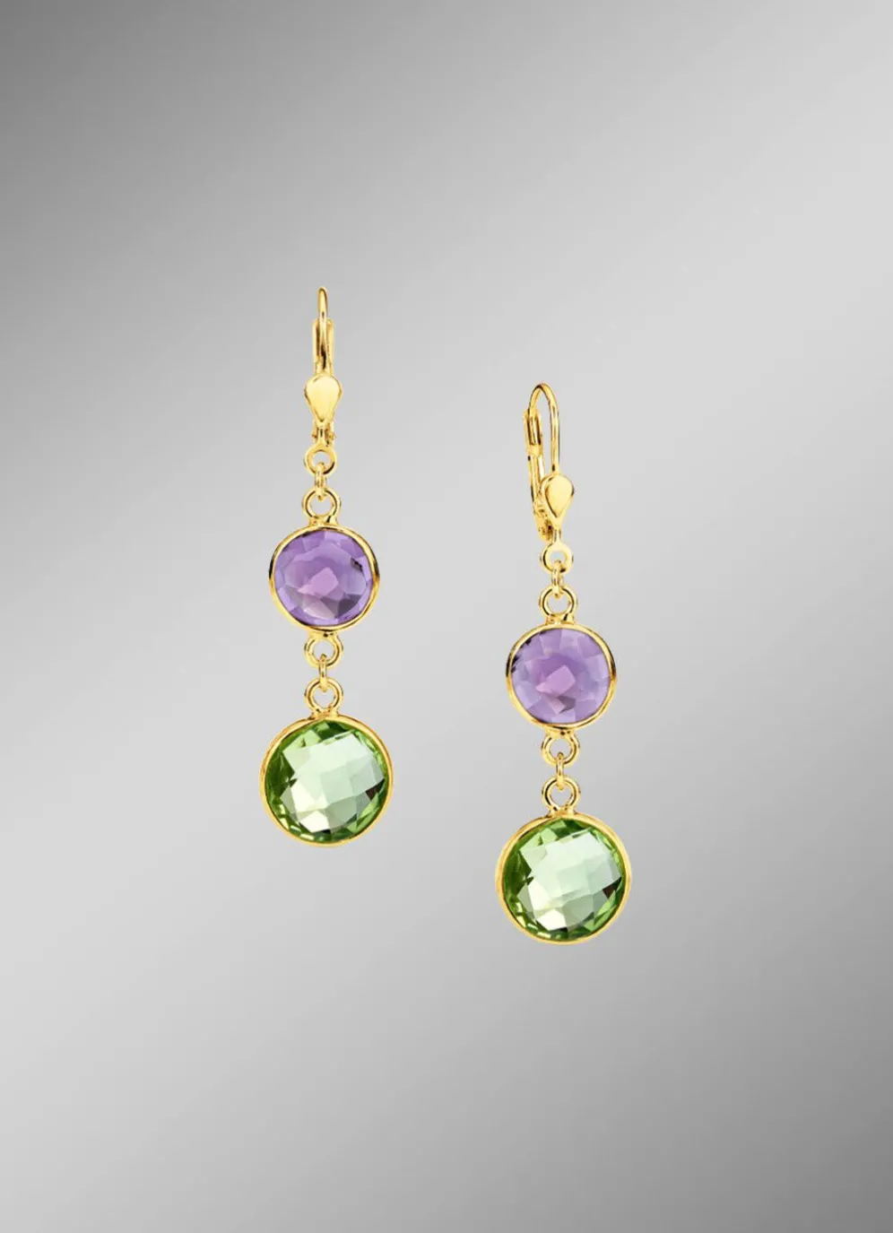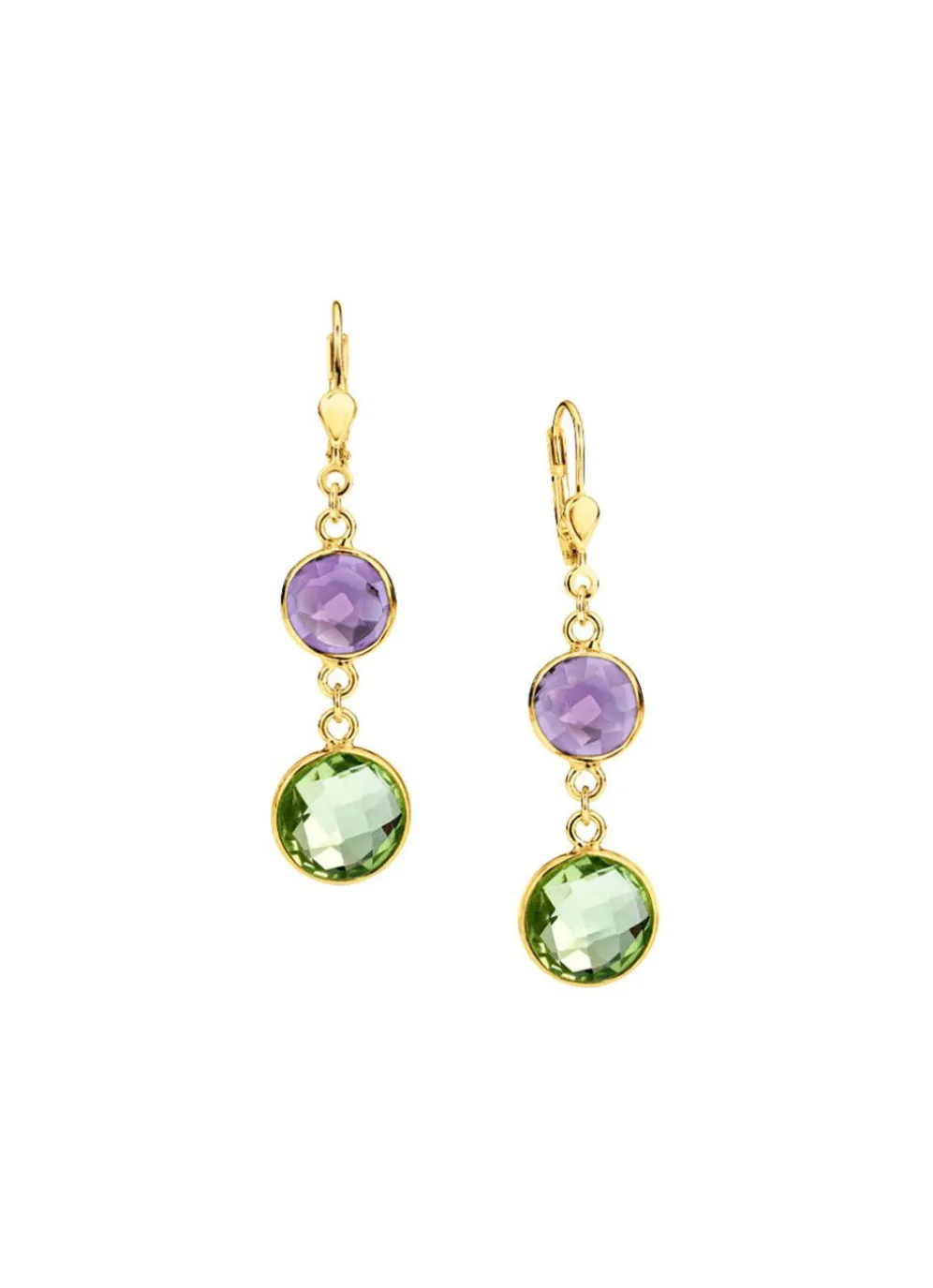 Veredeln Sie Ihren Look mit diesen exquisiten Ohrringen aus goldplattiertem Silber 925/- fein. Diese atemberaubenden Schmuckstücke sind mit Quarzen in den Farben Grün und Lila verziert. Mit einer Breite von 11 mm und einer Länge von 46 mm strahlen diese Ohrringe zeitlose Eleganz aus.