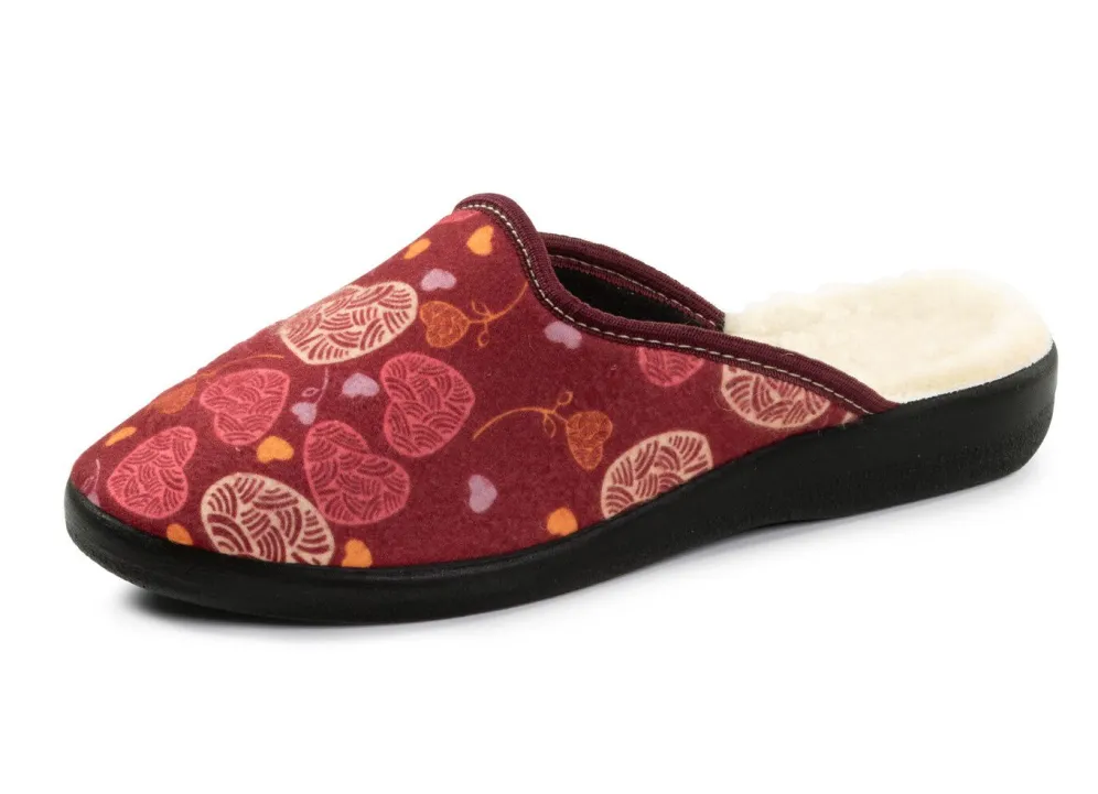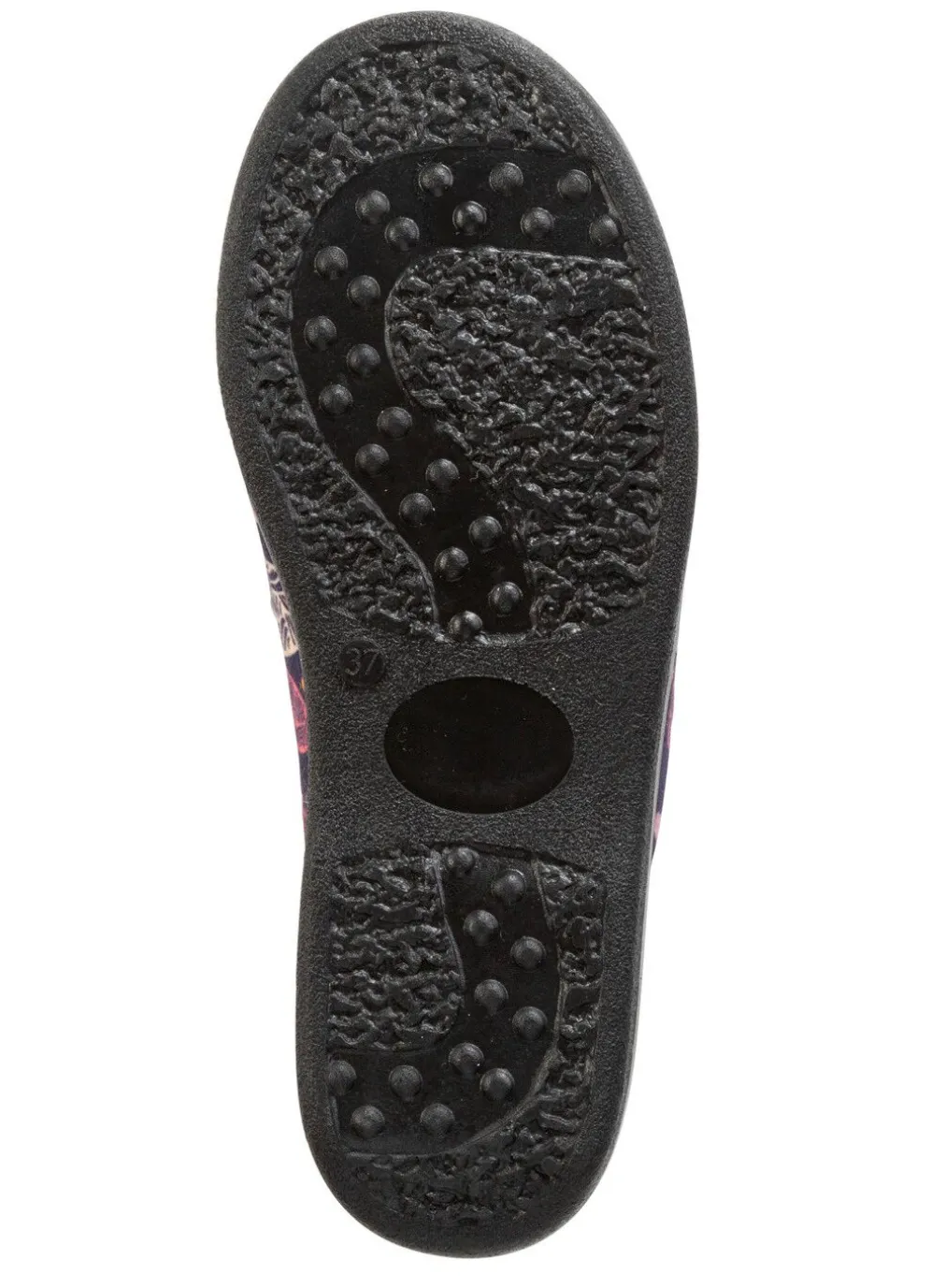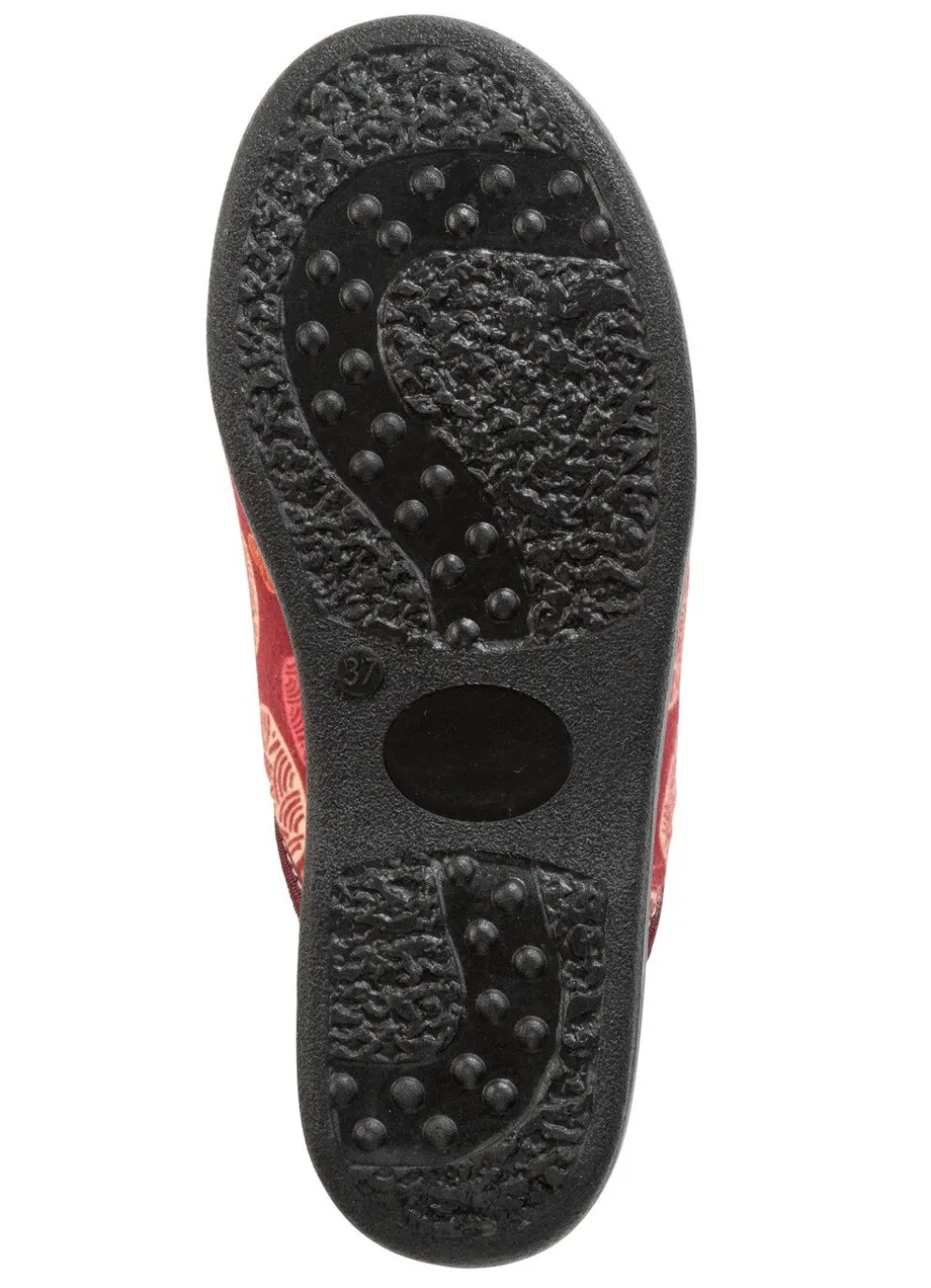 Hausschuhe aus niedlich bedrucktem Textilmaterial: Weite H, gepolstertes Textilfutter und Fußbettbezug aus reiner Schurwolle, superleichte PU-Laufsohle sowie 15 mm Keilabsatz