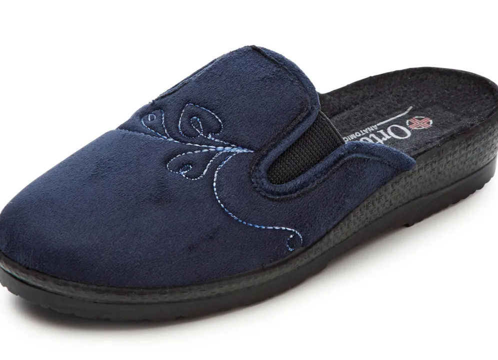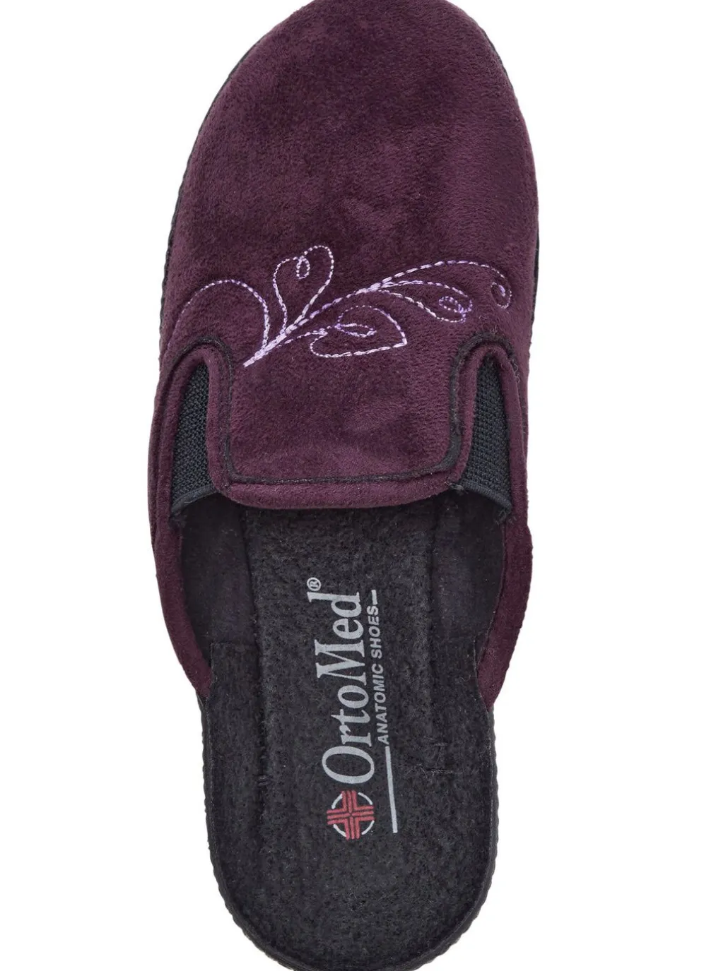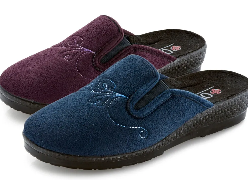 Hausschuhe aus weichem, besticktem Veloursmaterial: Weite H, zwei seitliche Gummizüge, gepolstertes Futter und Fußbettbezug aus Textil, superleichte PU-Laufsohle sowie 25 mm Keilabsatz