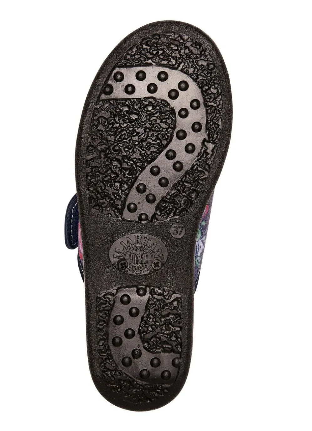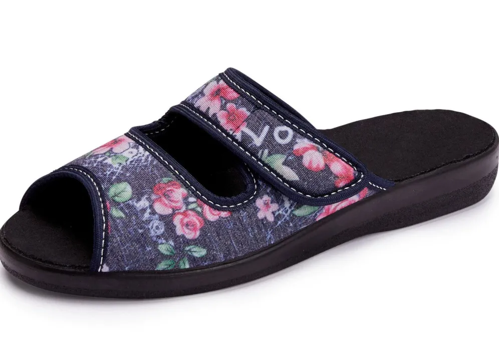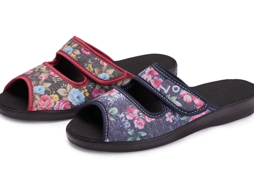 Hausschuhe aus floral bedrucktem Textilmaterial: in Weite H, verstellbare Klettspange, gepolstertes Futter und Fußbettbezug aus Textil, superleichte PU-Laufsohle, 15 mm Keilabsatz