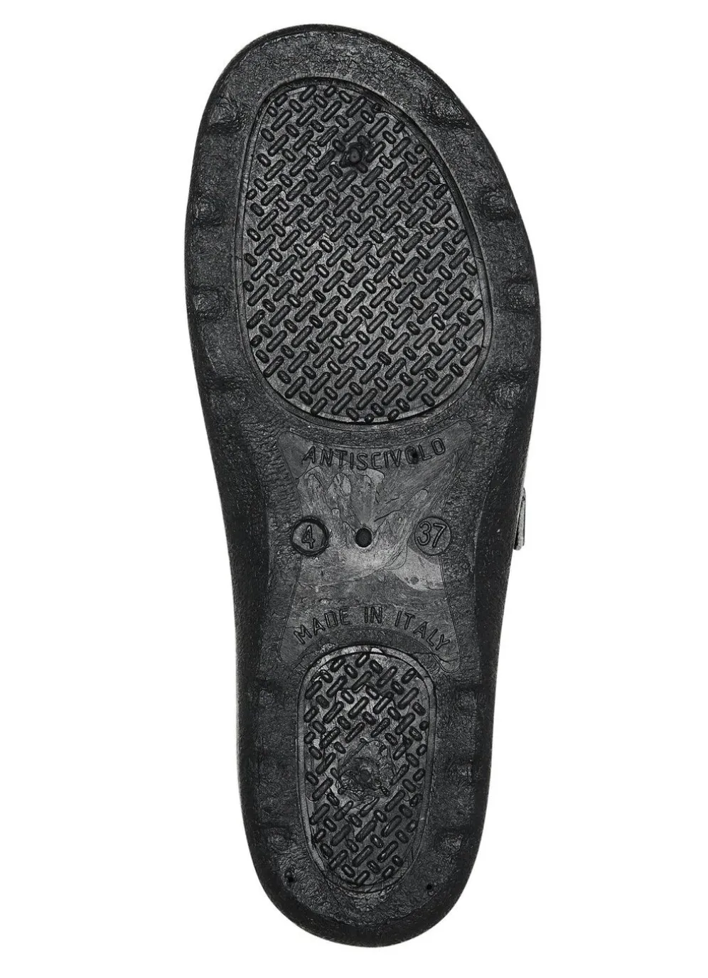 Pantoletten aus Nappaleder: in Weite H, zwei verstellbare Klettspangen, gepolstertes Lederfußbett, PU-Laufsohle sowie 30 mm Keilabsatz