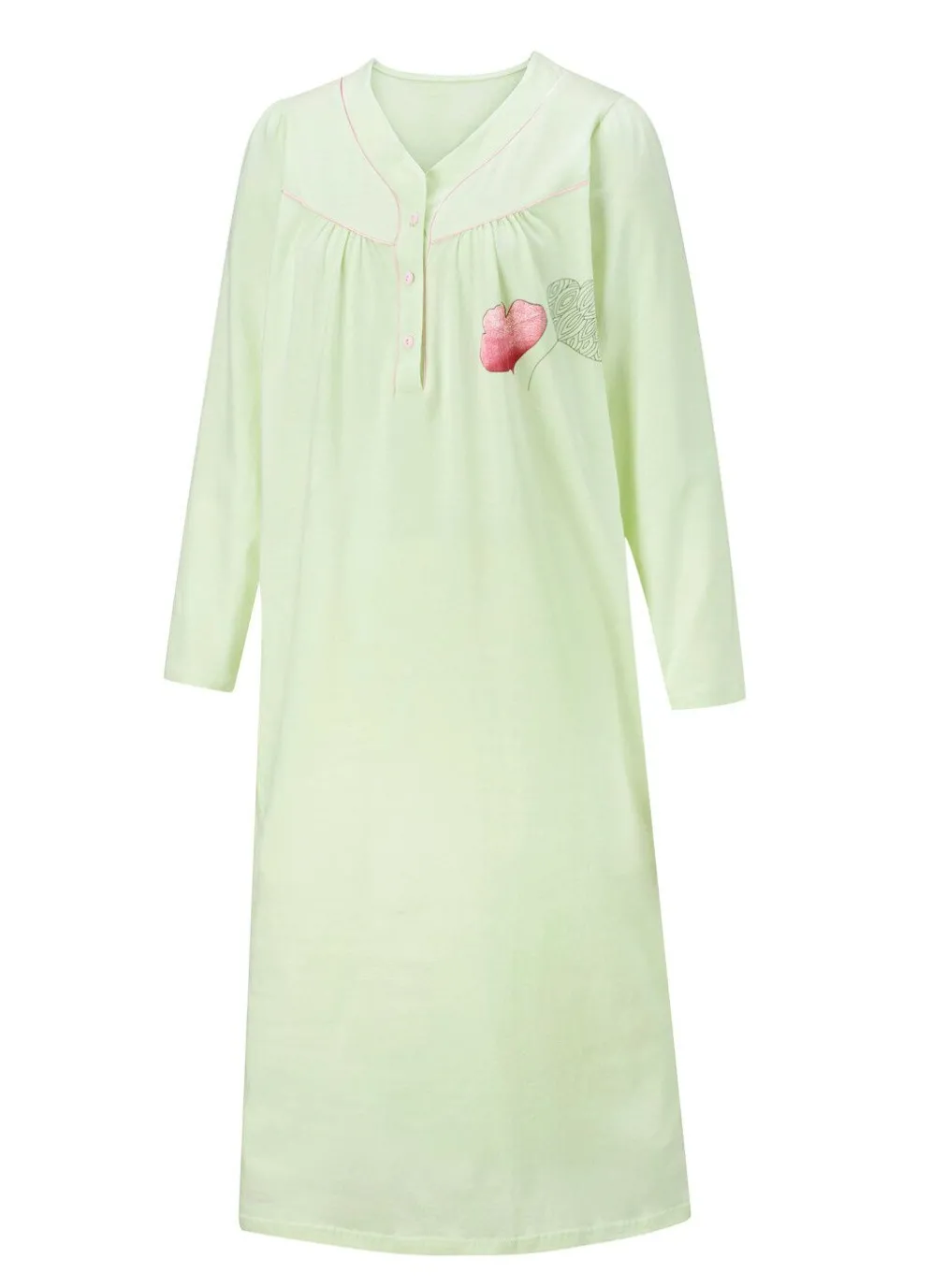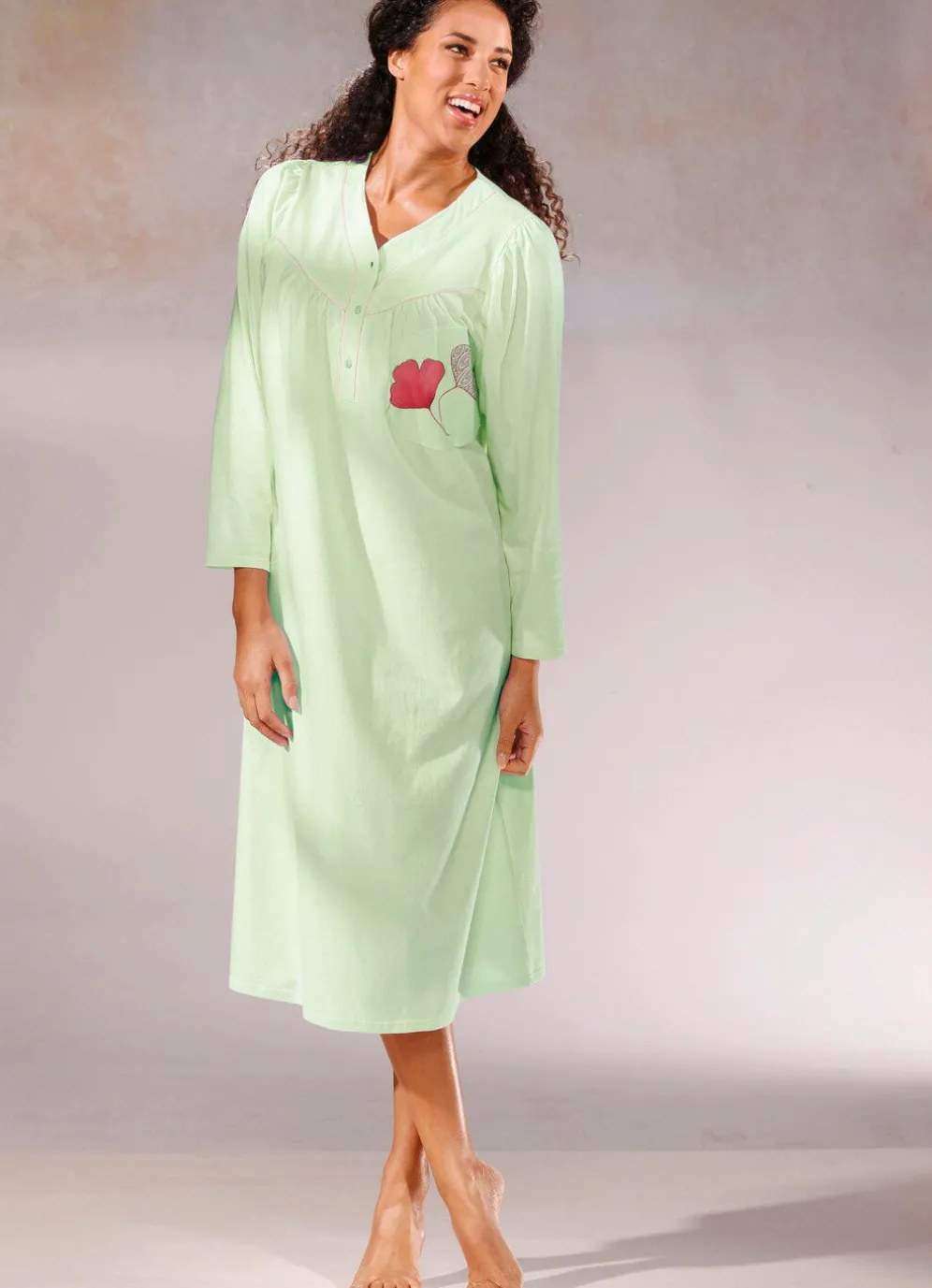 Preisgünstiger Zweierpack bestehend aus einem allover dessinierten und einem uni, wadenlangen Nachthemd mit Paspeln, Knopfleiste, Vorderpasse sowie Raffungen vorne und am Ansatz der ¾-langen Ärmel.