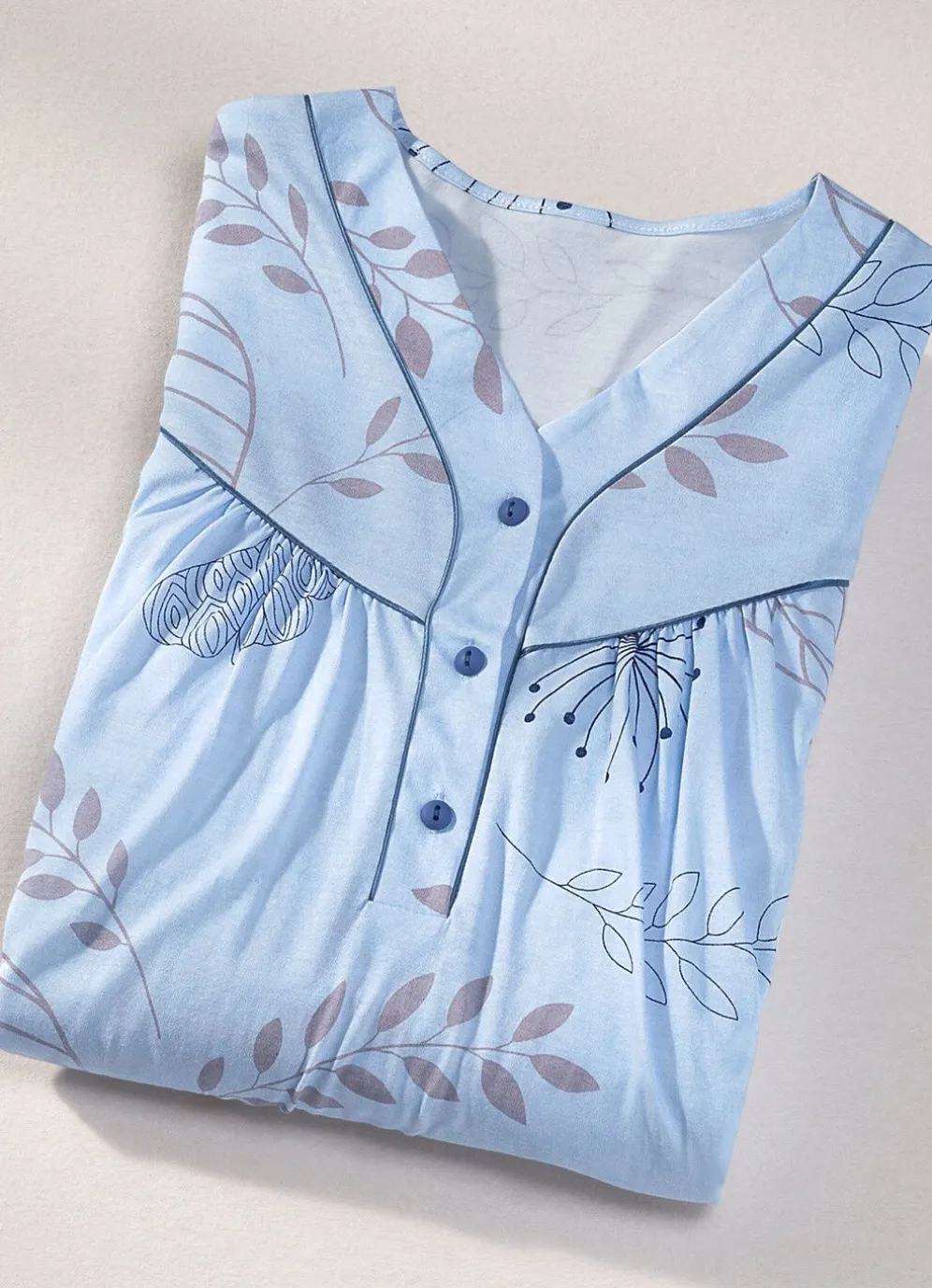 Preisgünstiger Zweierpack bestehend aus einem allover dessinierten und einem uni, wadenlangen Nachthemd mit Paspeln, Knopfleiste, Vorderpasse sowie Raffungen vorne und am Ansatz der ¾-langen Ärmel.
