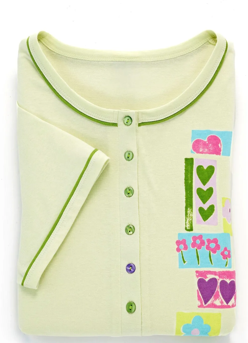 im Vorderteil sowie kurzen Ärmeln ausgestattet.