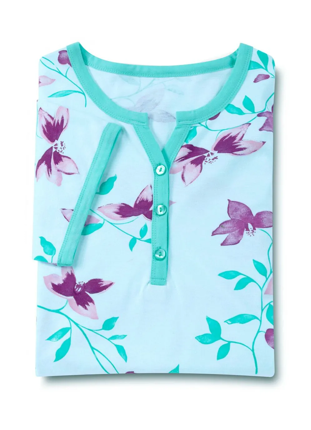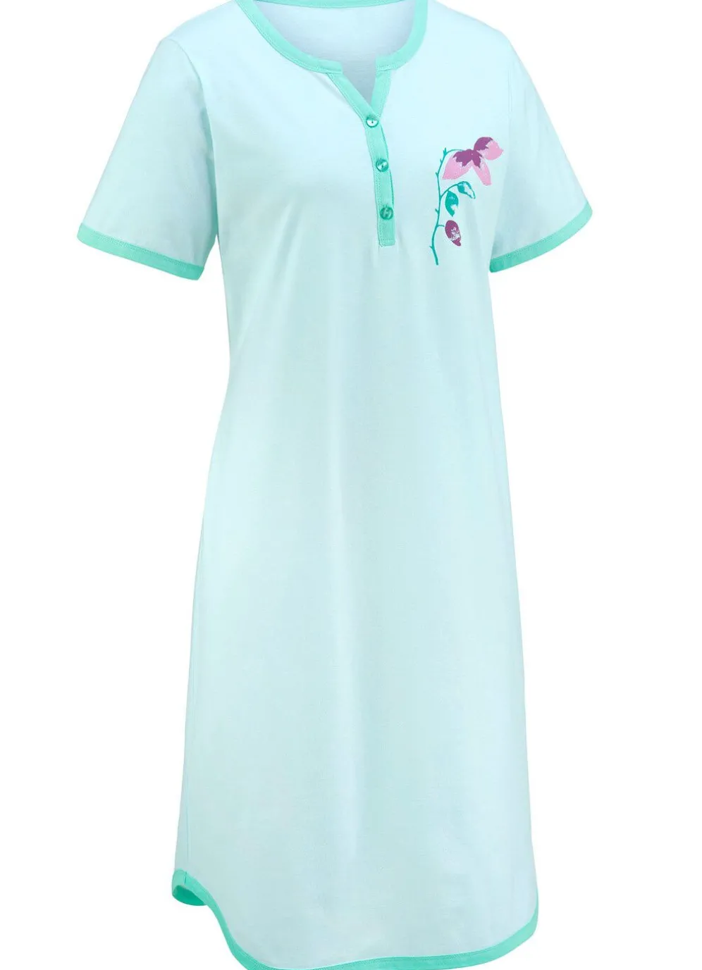 Knopfleiste, den kurzen Ärmeln sowie am abgerundeten Saum.