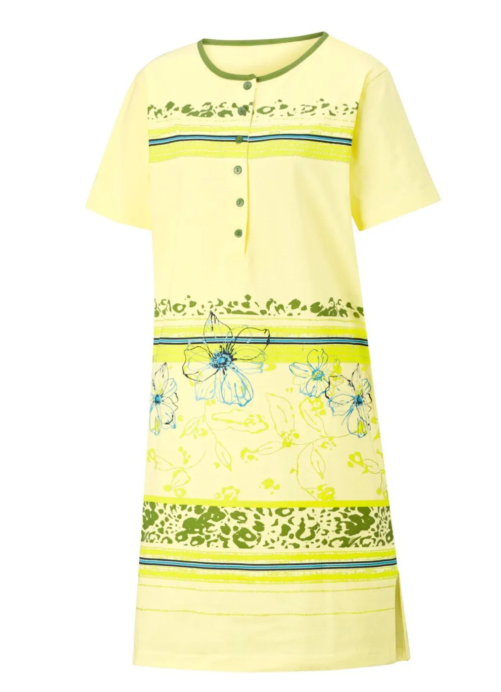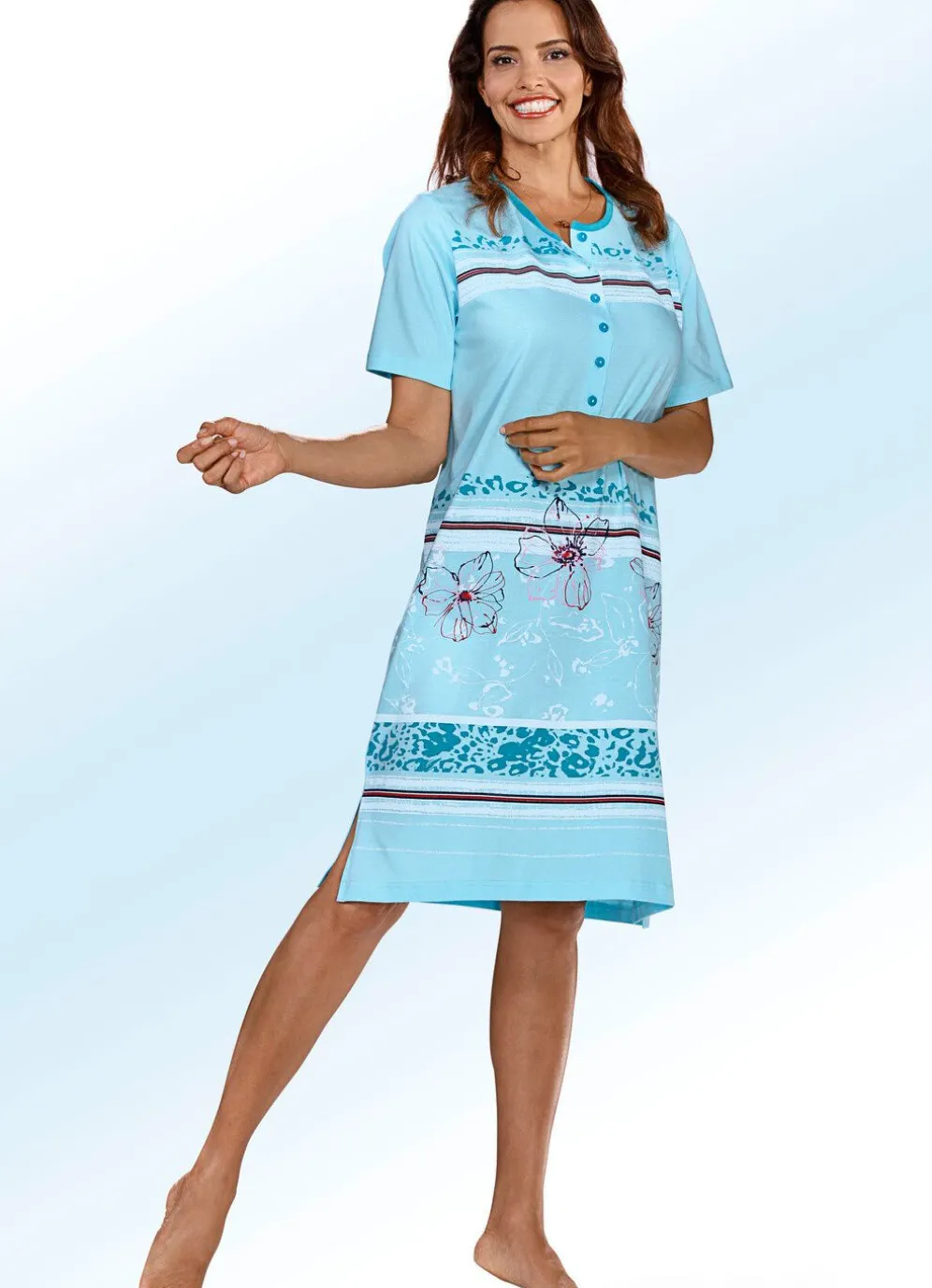 Knielanges Nachthemd im preiswerten Zweierpack: Einfassung am Halsausschnitt, lange Knopfleiste, platzierter Druck vorne, kurze Ärmel sowie seitliche Schlitze am Saum.