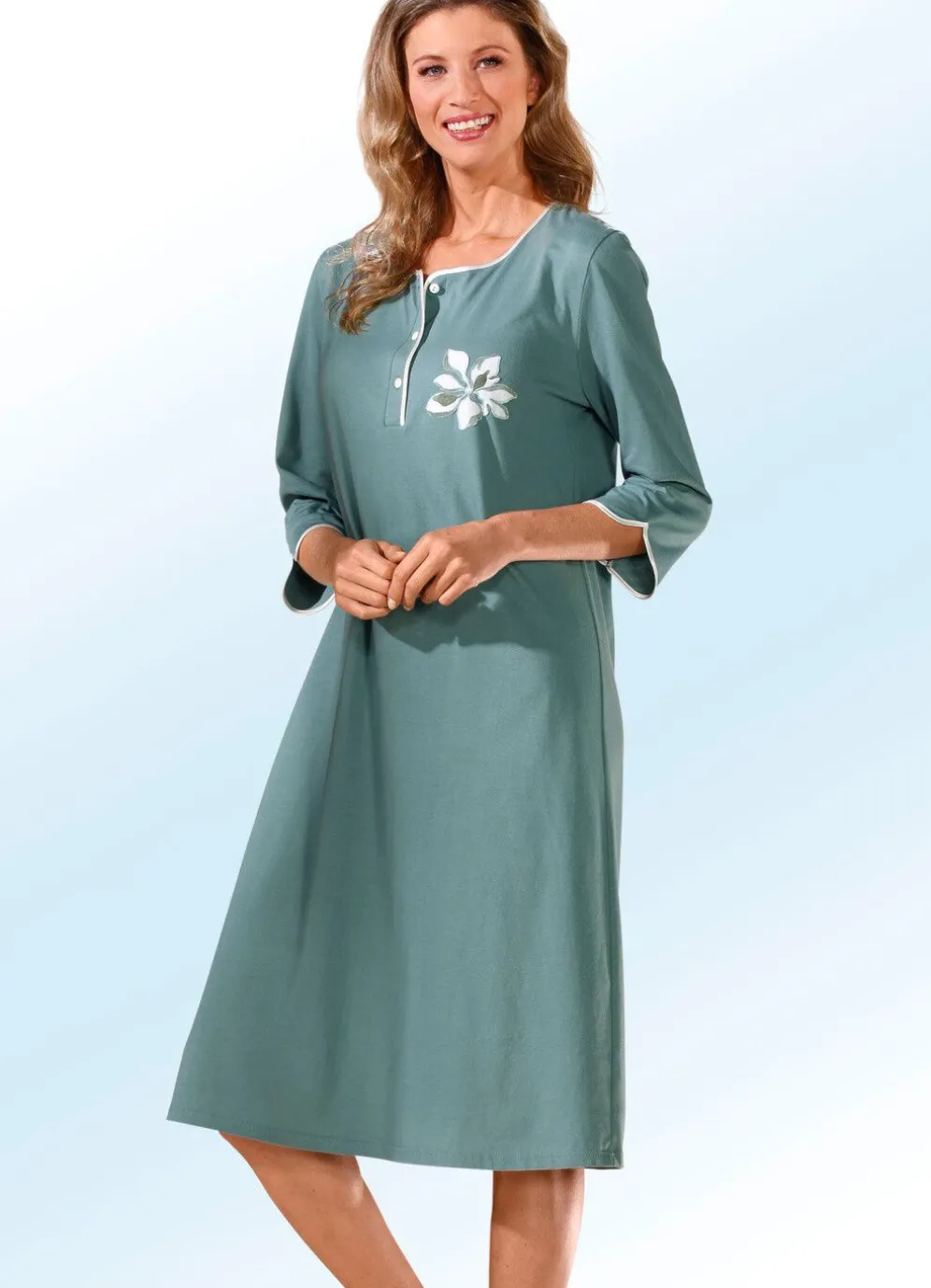 Im preisgünstigen Zweierpack bieten wir Ihnen diese wadenlangen Nachthemden an, bestehend aus einem uni Nachthemd mit platziertem Druck sowie einem allover dessinierten Modell, beide mit Satinbandeinfassung an Ausschnitt, Knopfleiste sowie abgerundetem Schlitz an den 3/4-langen Ärmeln.
