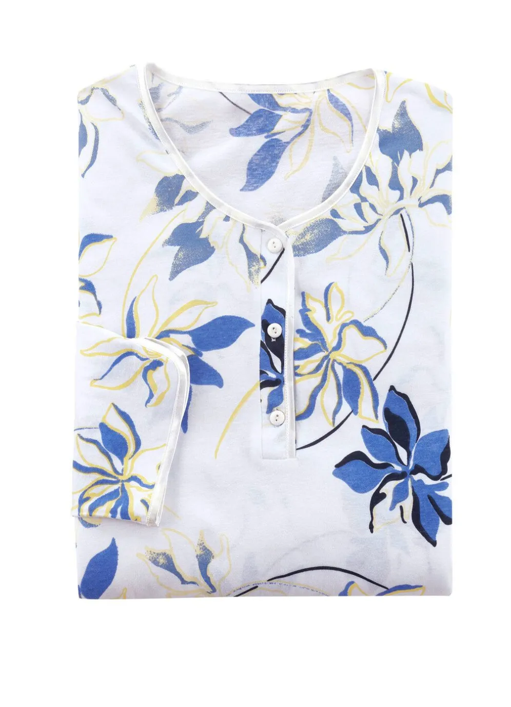 Im preisgünstigen Zweierpack bieten wir Ihnen diese wadenlangen Nachthemden an, bestehend aus einem uni Nachthemd mit platziertem Druck sowie einem allover dessinierten Modell, beide mit Satinbandeinfassung an Ausschnitt, Knopfleiste sowie abgerundetem Schlitz an den 3/4-langen Ärmeln.