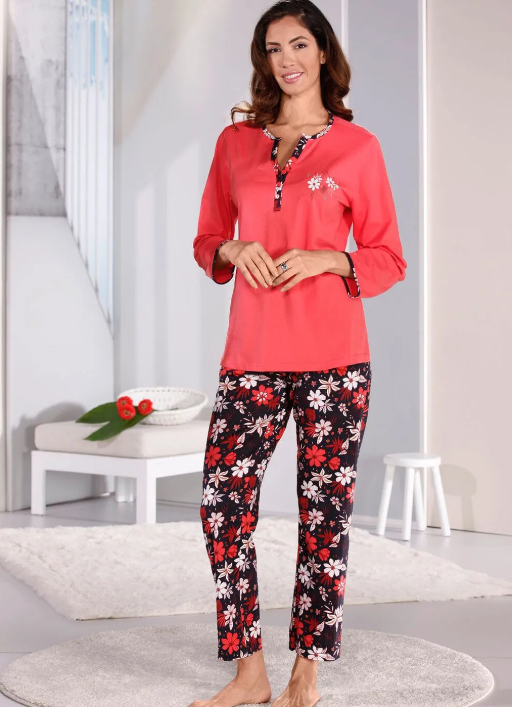 Attraktiver Zweierpack! Schlafanzüge von „Comtessa“ in Koralle-Schwarz-Bunt: Oberteile mit