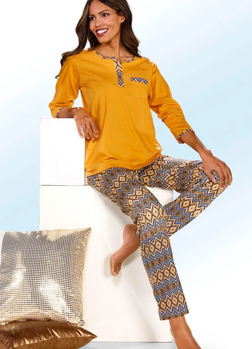 Pfiffiger Schlafanzug im preisgünstigen Zweierpack! Das Oberteil mit Einfassungen, Knopfleiste, Brusttasche mit Blende sowie langen Ärmeln. Lange Hose mit Dehnbund und offenen Beinabschlüssen.