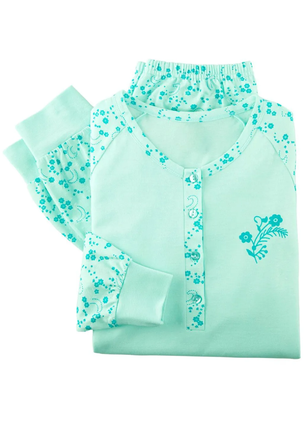 platziertem Druck im Vorderteil, Schultereinsätzen sowie langen Ärmeln. Lange Hosen mit Dehnbund.
