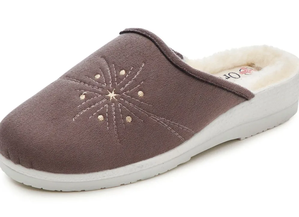 Hausschuhe aus weichem Veloursmaterial, mit Ziersteppung: Weite H, Warmfutter und Fußbettbezug aus reiner Wolle, superleichte PU-Laufsohle sowie 25 mm Keilabsatz